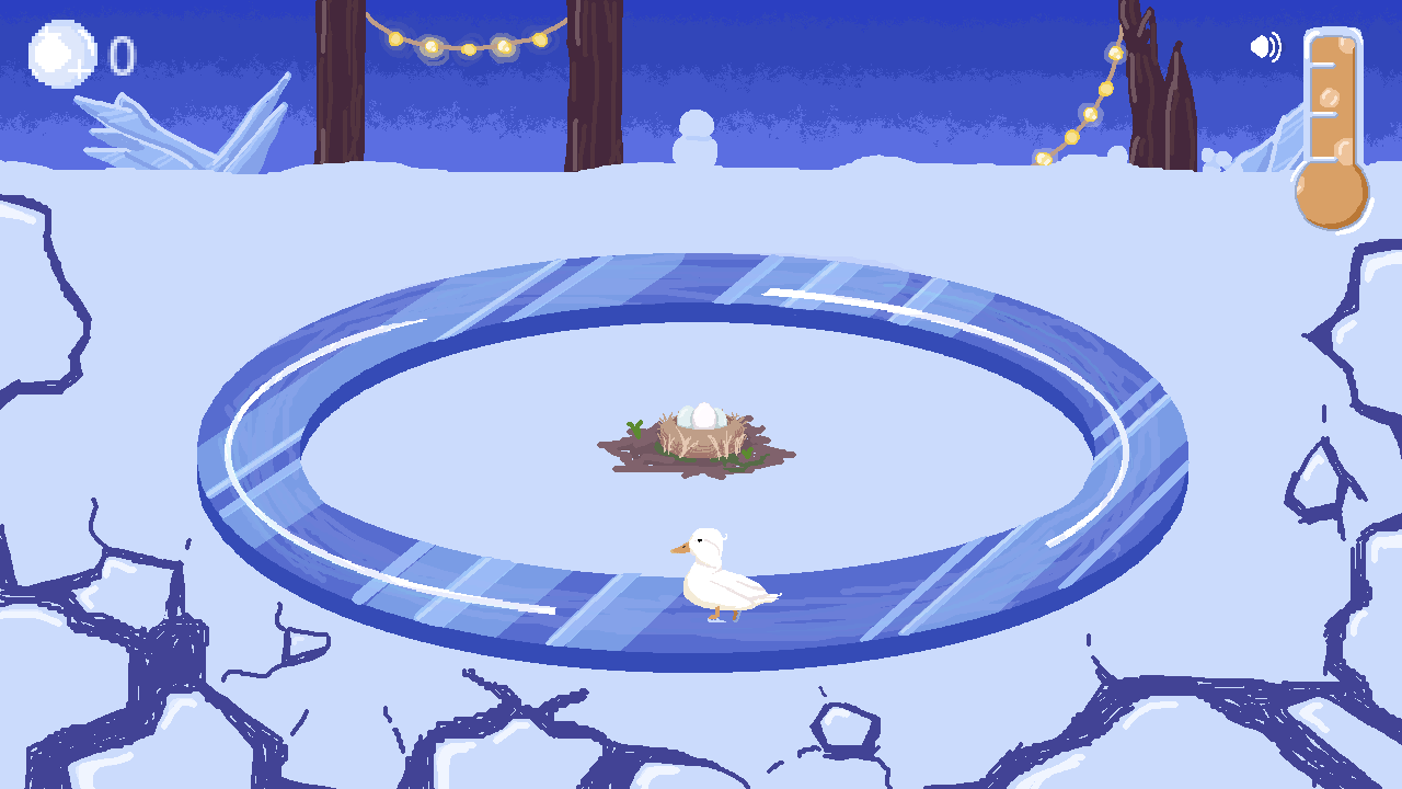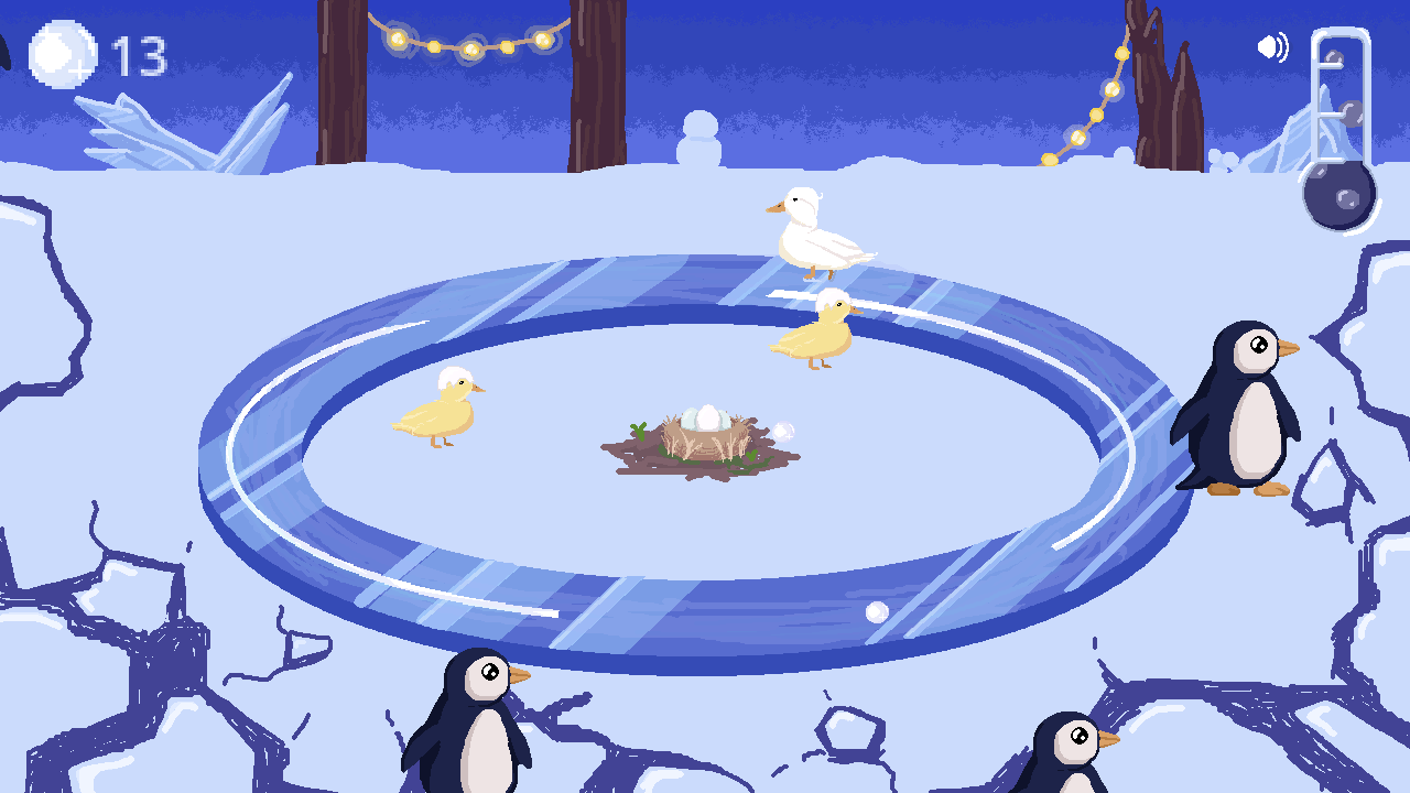 In an icy tundra a lonesome duck has to protect her eggs from evil penguins who love to have snowball fights. Catch the snowballs so the little ducklings can hatch and help you protect the nest against the endless hunger of the penguins. Nudge the penguins so they go home and leave you be.